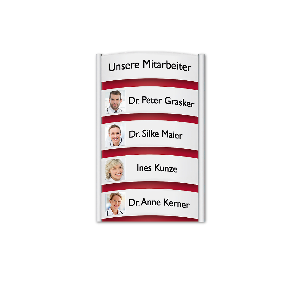Die Info-Display-Handhabung ist sehr einfach. Die Schilder werden unter leichter Spannung gewölbt und in die seitlich eingefrästen Führungsnuten eingesteckt. Austausch der Schilder ist jederzeit ohne Aufwand schnell zu erledigen.