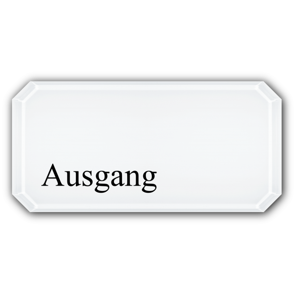 Achteckschild Typ „Düsseldorf“ mit facettierten Kanten, mehrfach im Qualitäts-Digitaldruck hinterdruckt und zum Schutz der Farbschicht rückseitig mit einer 1mm starken weißen Kunststoffplatte deckungsgleich verschweißt.