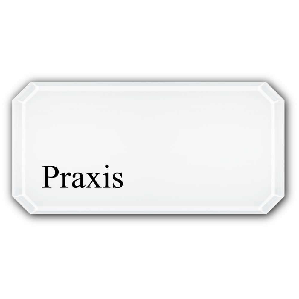 Achteckschild Typ „Düsseldorf“ mit facettierten Kanten, mehrfach im Qualitäts-Digitaldruck hinterdruckt und zum Schutz der Farbschicht rückseitig mit einer 1mm starken weißen Kunststoffplatte deckungsgleich verschweißt.